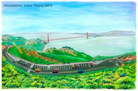 As I wrote here almost a year ago, cyclists like myself often choose the Marin Headlands for a decent workout close to the city. And for all the “freshly paved roads” I then mentioned, now there are so many more. Most notably comes the immediate climb from the north end of the Golden Gate Bridge, which we see in the above artist’s illustration. With the new bicycle lane clearly marked and not a flaw in all that fresh asphalt, you’ll be at the top in no time! From there just keep going, even onto some of the further-inland pavement yet to be redone.