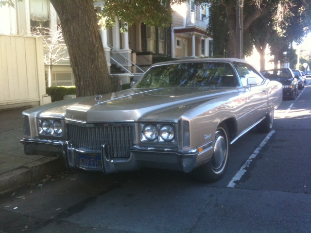 Yet another impressively well maintained, original-plated automotive classic stopped me in my pedaling tracks this morning, this one on Lake Street outside the Presidio. We’re looking here at a 1972 Cadillac Eldorado— hub caps, moldings and badges all intact– with if not its factory paint job, still very likely its original metallic color. Once again, I pause with a nod of appreciation for this “classic of the day.”