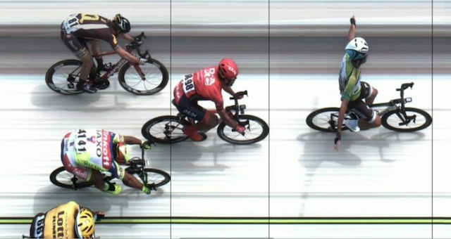 Two seconds behind at the start of the final stage turns into one second after the intermediate sprint time bonuses. As such, it must be solved in the last full-tilt sprint to the finish. And so it is, by the very narrowest of margins, all coming down to less than the width of a road tire. In the closest victory in the history of this tour, thanks to a four-second time bonus for finishing the day in third (narrowly enough), the great Peter Sagan wins the 2015 Amgen Tour of California!